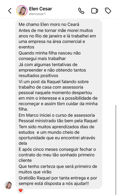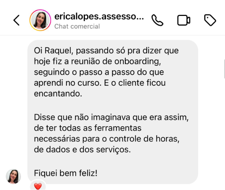 Foi aí que desenvolvi o método Assessora Expert, um treinamento avançado onde te ensino de A a Z sobre a profissão. E o resultado foi surpreendente, na primeira turma deste treinamento, 2 alunas já foram contratadas para fazerem parte do meu time, e como era esperado, já vieram prontas, treinadas!